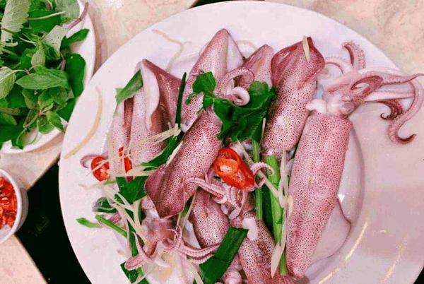 Ăn nóng mới ngon. Mực vừa mới hấp cuốn bánh tráng chấm kèm mắm tỏi ngon tuyệt vời.